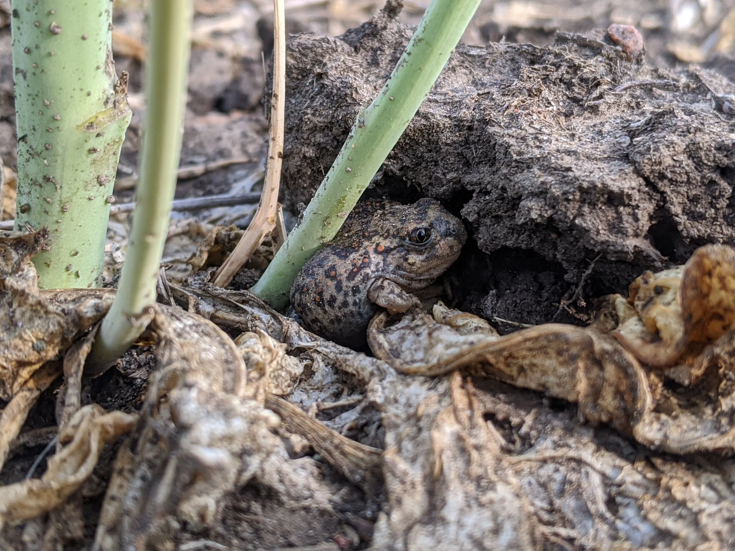 Amphibians in Alberta are small and detecting them on a large landscape can be challenging. Some species, like leopard frogs, spend most of their time in the water while others, like the plains spadefoot, can spend months buried underground. Detection of sensitive amphibians comes down to timing. The best time to detect species is during the spring and early summer when our resident species capitalize on warm and wet weather to reproduce. Each species has a distinct mating call and physical surveys, or the deployment of acoustic recorders, can be used to identify species present. Additionally, timing amphibian surveys with precipitation events outside of the breeding season increases the chances of detecting species that beat the heat by burrowing.